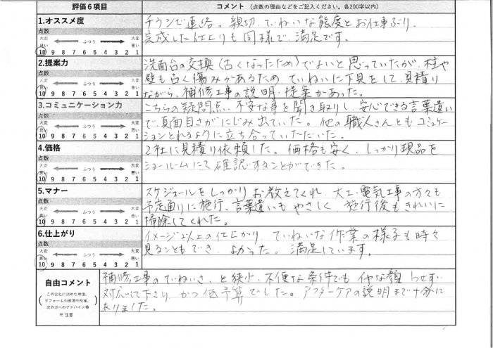 補修工事のていねいさと狭小・不便な条件でもイやな顔はせず対応して下さり、かつ低予算でした。アフターケアの説明まで十分にありました。
