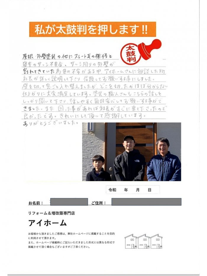 屋根・外壁塗装の他にスレート瓦の補修と寝室のサッシ不具合、サッシ周りの外壁が割れてきていた為、色々不安がある中、アイホームさんに相談した所、社長が詳しく説明して下さり信頼してお願いすることにしました。