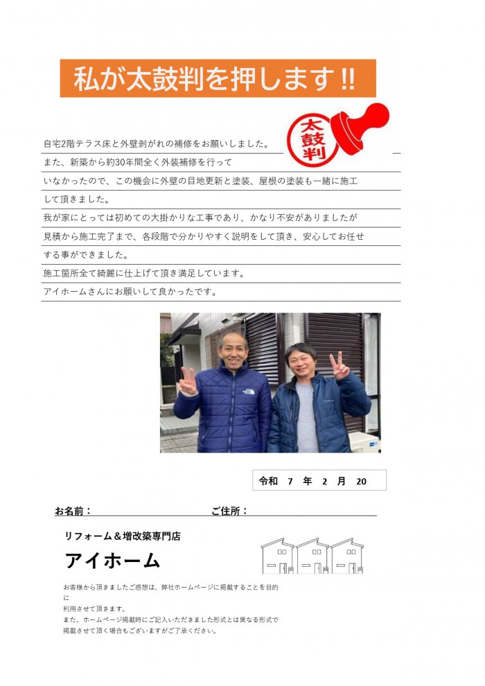 自宅2階テラス床と外壁剥がれの補修をお願いしました。