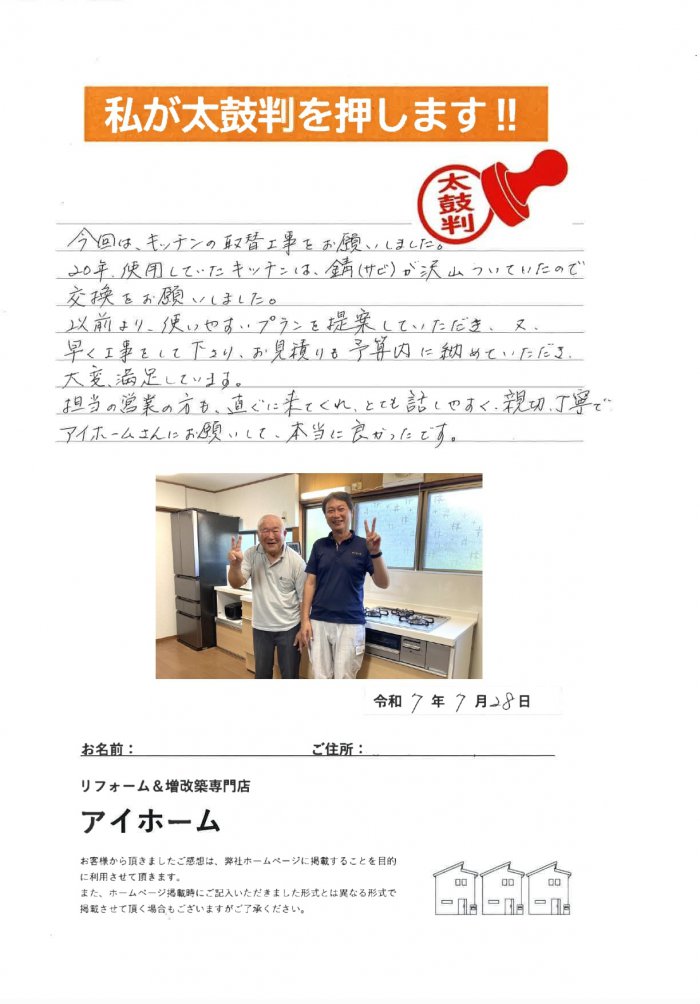 早く工事をして下さりお見積りも予算内に収めていただき、大変満足しています。