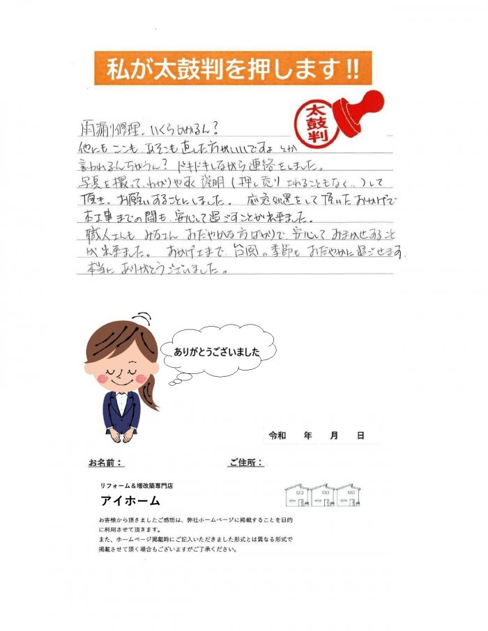 応急処置をしてい頂いたおかげで本工事までの間も安心して過ごすことが出来ました。